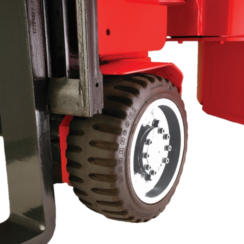 Dokazano varen oprijem z naloženim ali neobremenjenim vozilom v vseh delovnih pogojih. Trpežne elastične gumijaste pnevmatike na vseh straneh omogočajo delovanje na vseh tleh skladišča. Brez drgnjenja pnevmatik, s popolnim diferencialnim pogonom na obeh kolesih pri zavijanju
